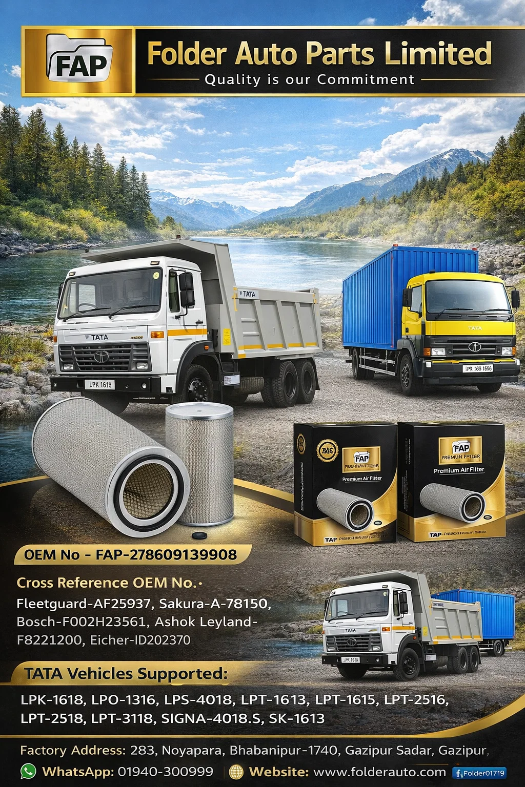 The Premium Air Filter (OEM No: FAP-278609139908) from Folder Auto Parts Limited is engineered to deliver superior filtration, high airflow, and extended service life, even under the toughest road and climate conditions in Bangladesh and South Asia. Designed using advanced filtration technology, this air filter protects engines while improving fuel efficiency and overall performance.